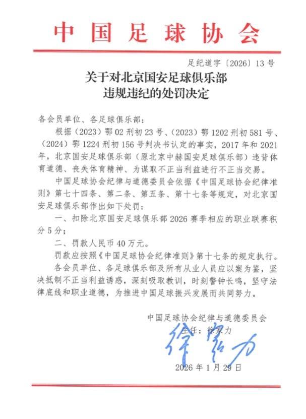 被扣5分+罚40万!国安官微硬刚足协:人在做天在看,球迷支持上诉